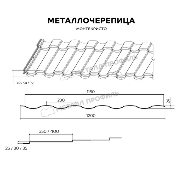 Стальная черепица МОНТЕКРИСТО подходит для использования вне зависимости от вида строительства или особенностей климата. Данный профиль эстетично выглядит на скатах малой и большой площади, подчеркивая красоту всех типов крыши. Длина и высота ступеней металлочерепицы ― 350, 400 мм и 25, 30, 35 мм, соответственно. С рассматриваемым профилем ваша крыша будет выглядеть так, будто покрыта керамической черепицей. МОНТЕКРИСТО: изысканное решение для вашей кровли!