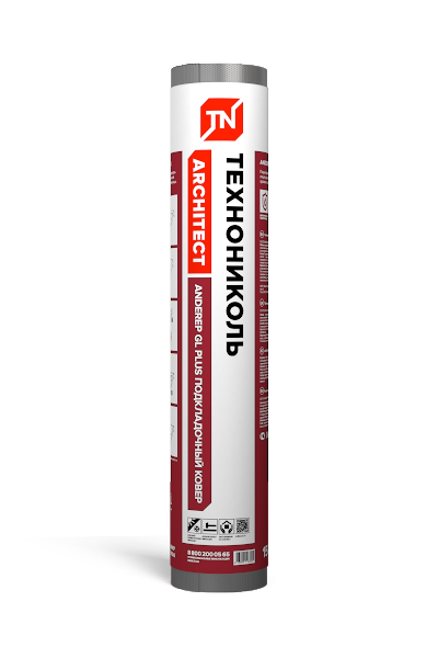 Битумно-полимерный подкладочный ковер механической фиксации с клеевыми монтажными полосами с основой из стеклохолста для скатных кровель с финишным покрытием из гибкой битумной черепицы.