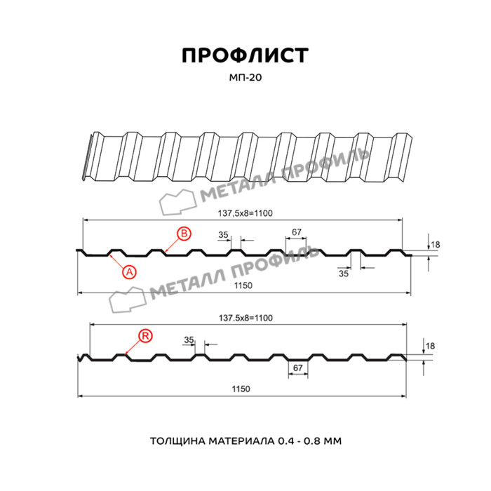 Профнастил МП-20 относится к многофункциональным cтройматериалам. В сравнении с другими модификациями профлиста, он выпускается в трёх вариациях: А, В и R. Разновидности А и В используются для кровельных работ, монтажа ограждений, облицовки стен, для внутренней отделки складских помещений, гаражей, ангаров и т.п. Профиль МП-20 с буквой R характеризуется наличием капиллярной канавки и используется для обустройства кровли. В зависимости от сферы применения, МП-20 изготавливается из металлопроката толщиной от 0,4 до 0,8 мм. Важная деталь: несмотря на цифру 20 в названии, на самом деле глубина этого профнастила – 18 мм. Он является материалом эконом-класса и обладает доступной ценой. МП-20 – прочный и качественный стройматериал, преимущества которого по достоинству оценивают не только частные лица, но и промышленные строители. Он отличается приличной жёсткостью, переносит большие статические нагрузки и эффективно противостоит нагрузкам динамическим.